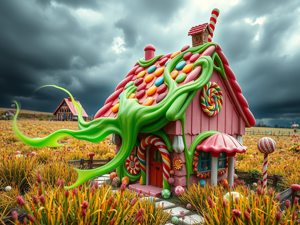 INPUT: “A candy house on the prairie about to be demolished by a liquid green twister.”