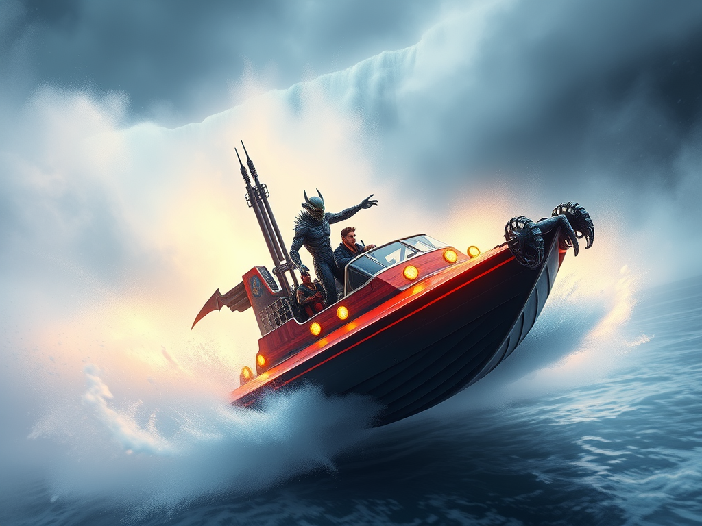 INPUT: “A dragonboat commanded by an alien being plunges over Niagra Falls.”