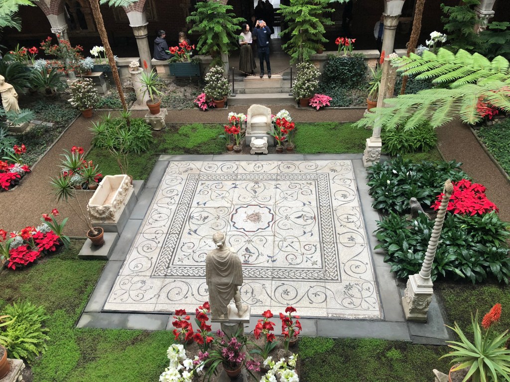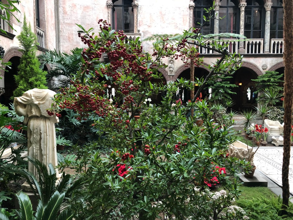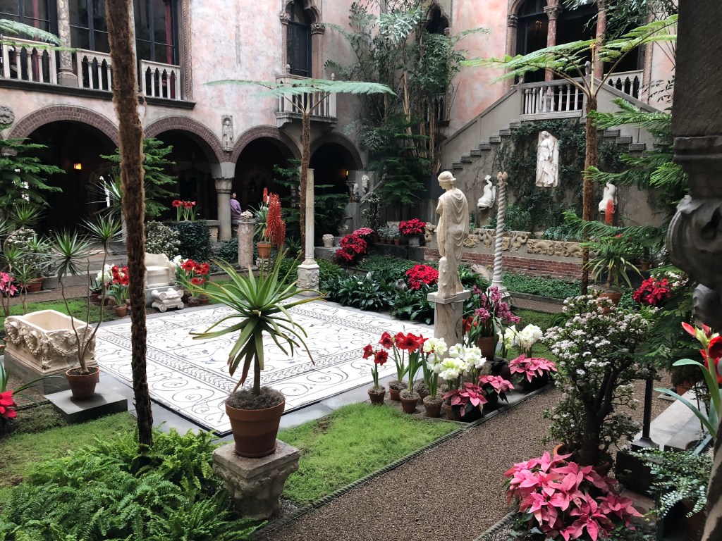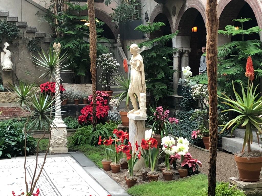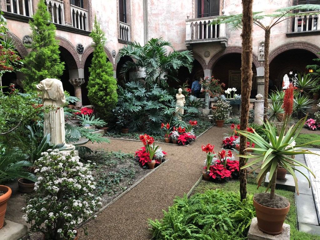 I love this museum. Particularly in the winter when it is like traveling to a balmy Venice in the summer in the 19th century. The center courtyard is literally the centerpiece of the museum, an inside out Venetian palace with seasonal garden displays, right now displaying the fabulous Holiday Garden featuring red amaryllises, jade trees, green aloe, and dusty silver miller.