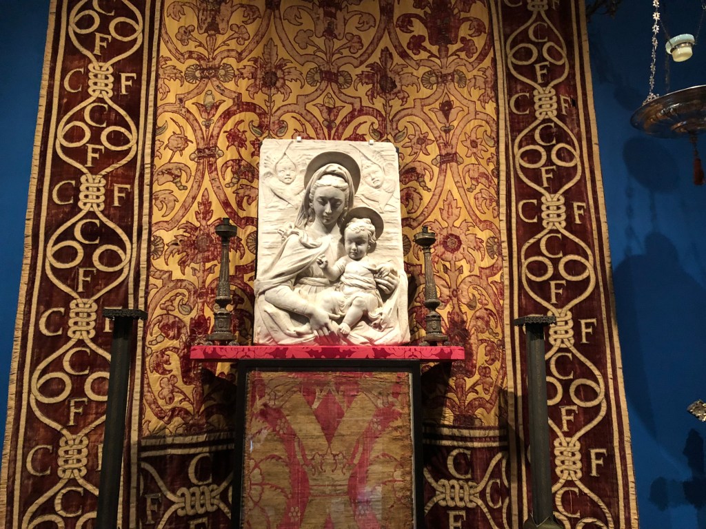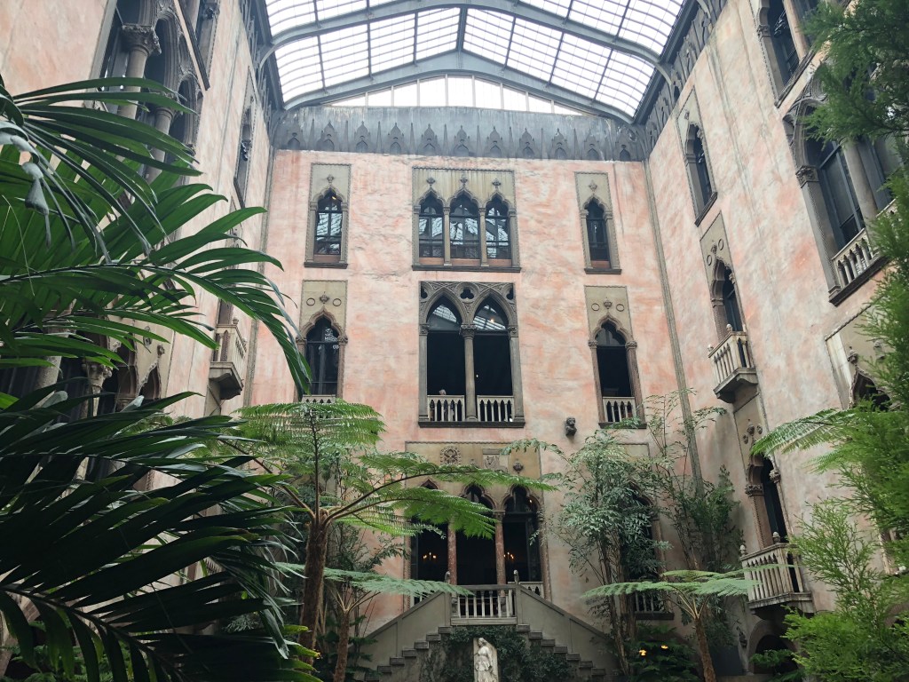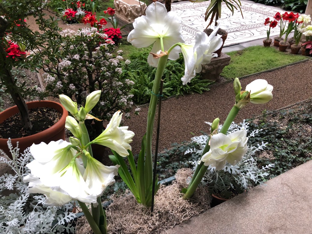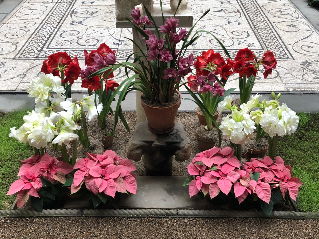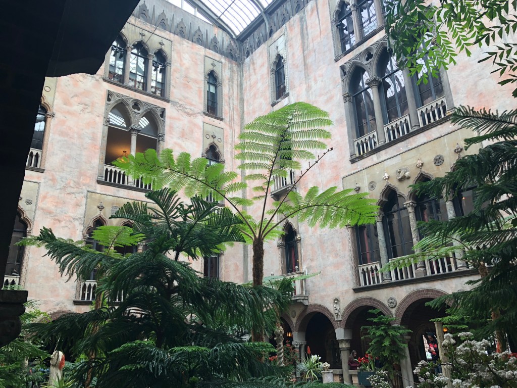 I love this museum. Particularly in the winter when it is like traveling to a balmy Venice in the summer in the 19th century. The center courtyard is literally the centerpiece of the museum, an inside out Venetian palace with seasonal garden displays, right now displaying the fabulous Holiday Garden featuring red amaryllises, jade trees, green aloe, and dusty silver miller.