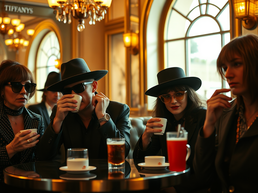 INPUT: A group of Clockwork Orange droogs having cappuccino at Tiffany’s.
