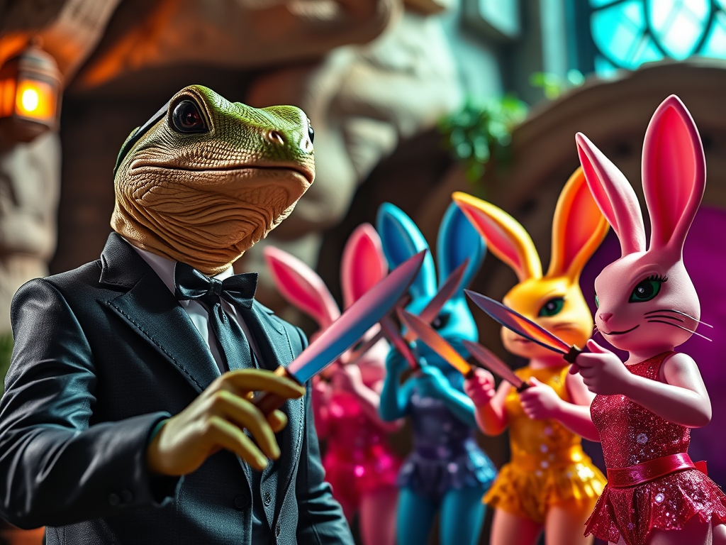INPUT: A lizard gangster in charge of Playboy bunnies juggling knives at the Playboy mansion grotto.