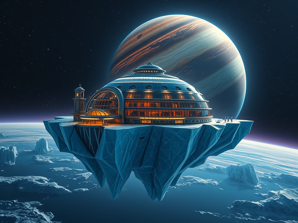 INPUT: A space iceberg with a domed five-star hotel on it in orbit around the planet Jupiter.