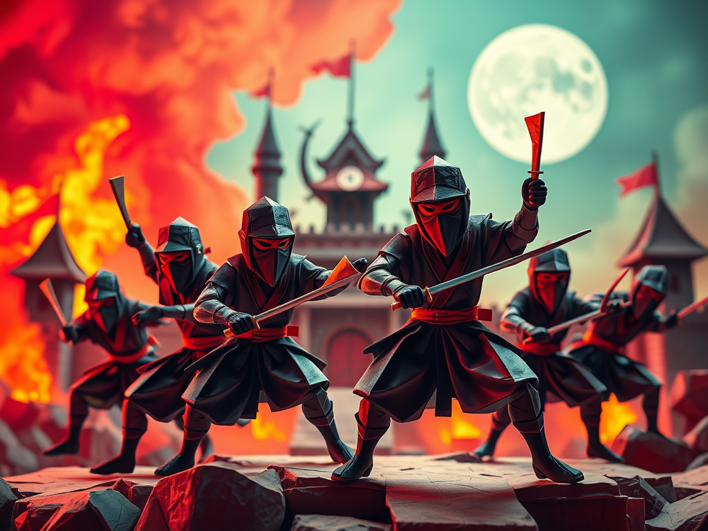 INPUT: Ninja warriors storming the castle of the evil Shogun armed with shurikens made from post-it notes.