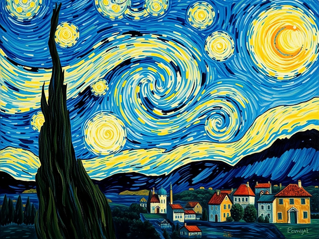 INPUT: Vincent Van Gogh painting “The Starry Night” in the middle of a starry night in the middle of a painting.