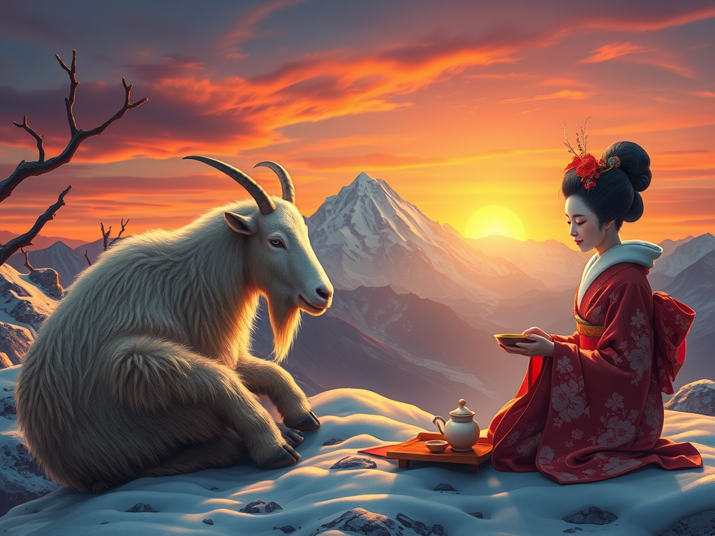 INPUT: A yeti and a mountain goat being served a Japanese Tea Ceremony by a geisha on the top of Mount Everest with a beautiful sunset in the background.