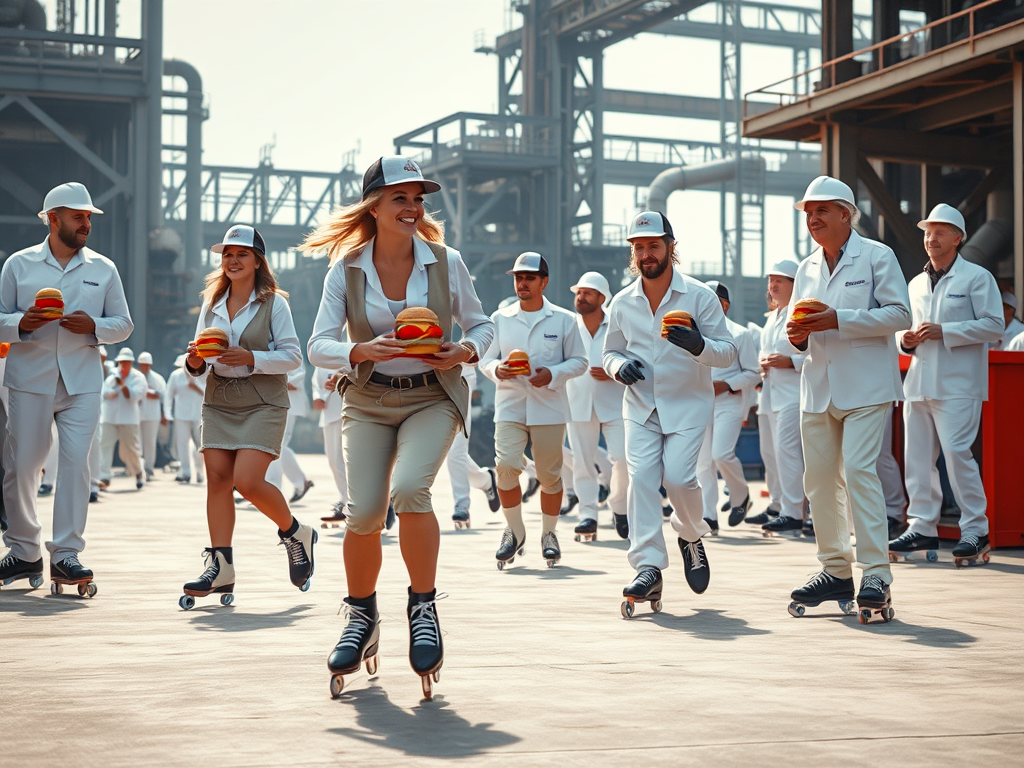 INPUT: Roller skating carhops bringing hamburgers and fries to white suited steelworkers at a steel mill.