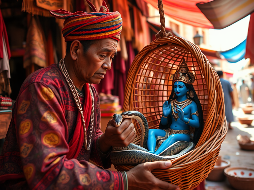 INPUT: A Burmese snake charmer with a blue-skinned goddess emerging from a wicker basket on a lazy afternoon in a bazar in Marrakech.