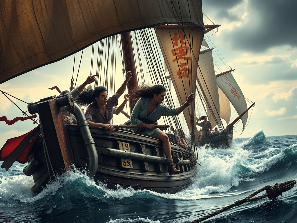 INPUT: A Chinese junk pirate ship with a crew of women attacking a British man-o’-war commanded by Margaret Thatcher.