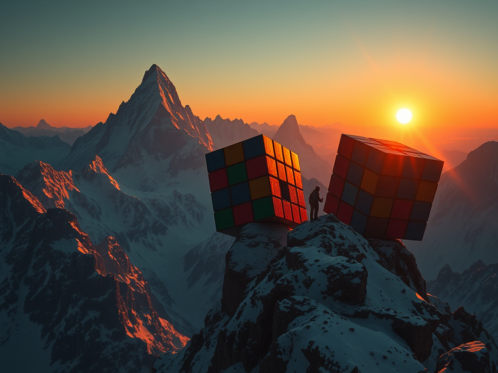 INPUT: A group of intrepid 19th century mountaineers scaling a mountain range made out of giant Rubik’s Cubes bathed in the gold and crimson light of twin suns.