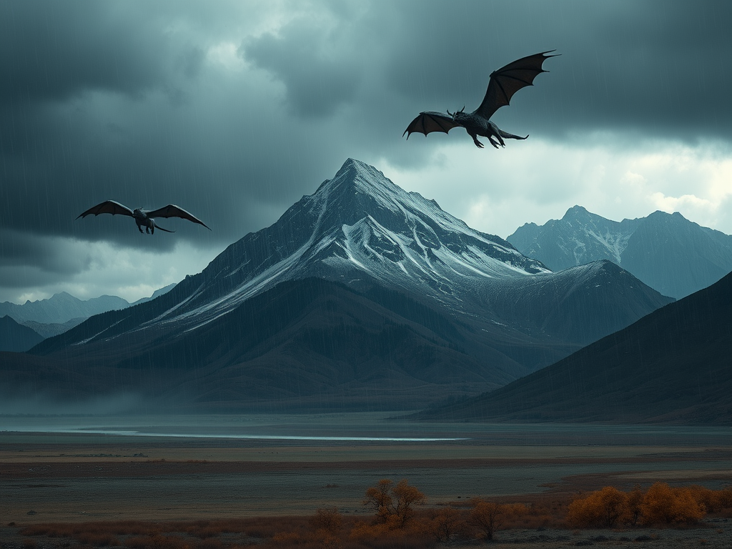 INPUT: A lone mountain rising out of a desolate plain with dragon-like creatures circling it in the midst of an autumn rainstorm.