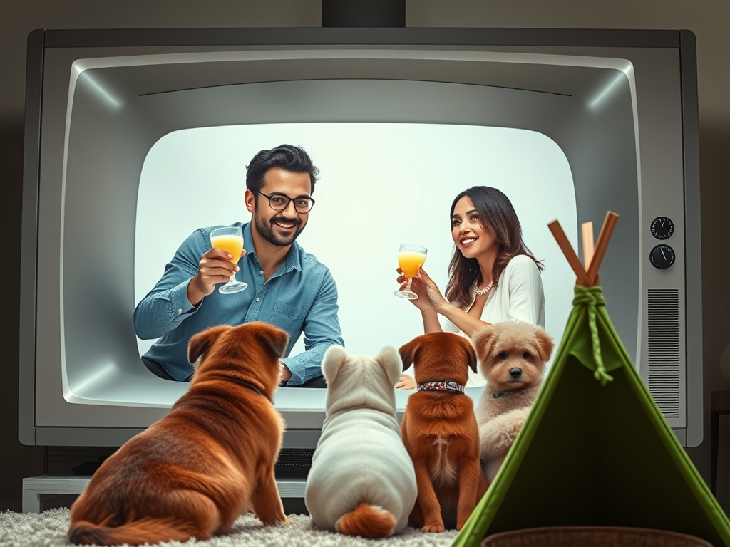 INPUT: A modern husband and wife living inside a giant TV set watching a TV program about TV, sipping tea out of alabaster goblets while their two dogs watch on from a teepee made out of green felt.
