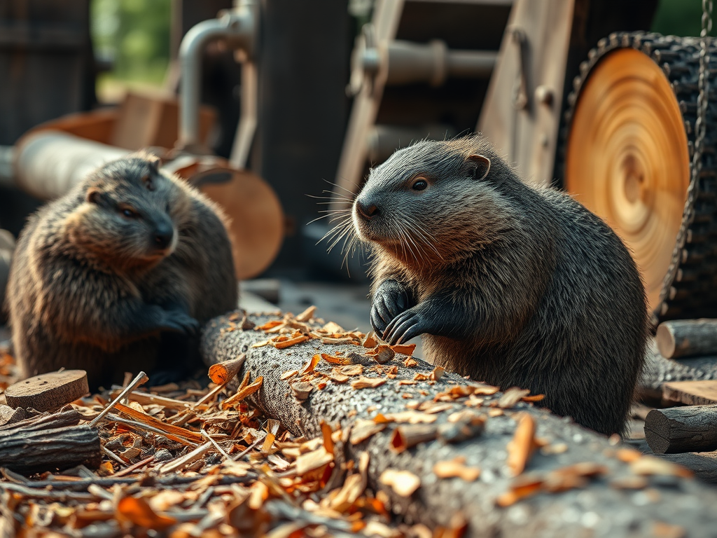 INPUT: Beavers working at a sawmill cutting up redwood trees.