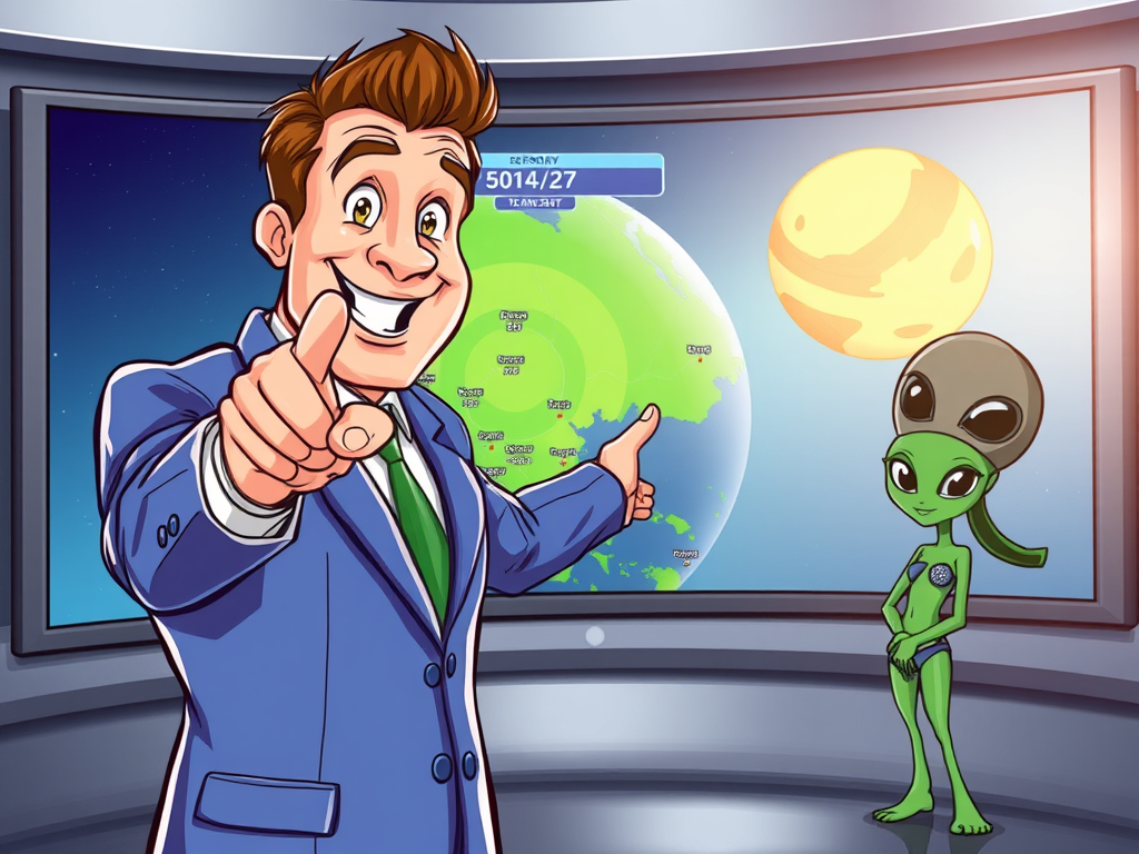 INPUT: A TV weatherman pointing to a weather map of the planet Pluto while a green alien girl calls the shots.