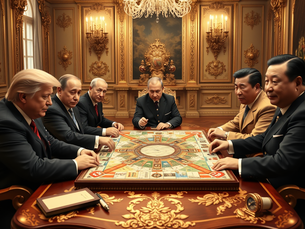 INPUT: Donald Trump, Vladimir Putin, Benjamin Netanyahu, Keri Starmer, and Xi Jinping sitting at a table playing World Monopoly at the palace of Versailles attended by money servants in frock coats.