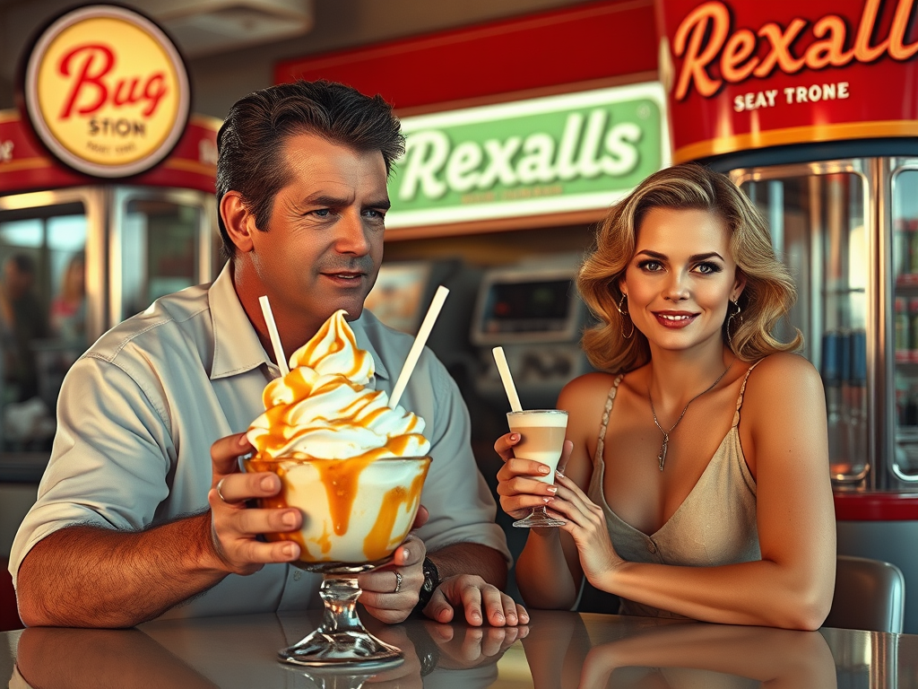 INPUT: Mel Gibson and Charlize Theron sharing a butterscotch sundae at a soda fountain at a 1950s Rexalls store.