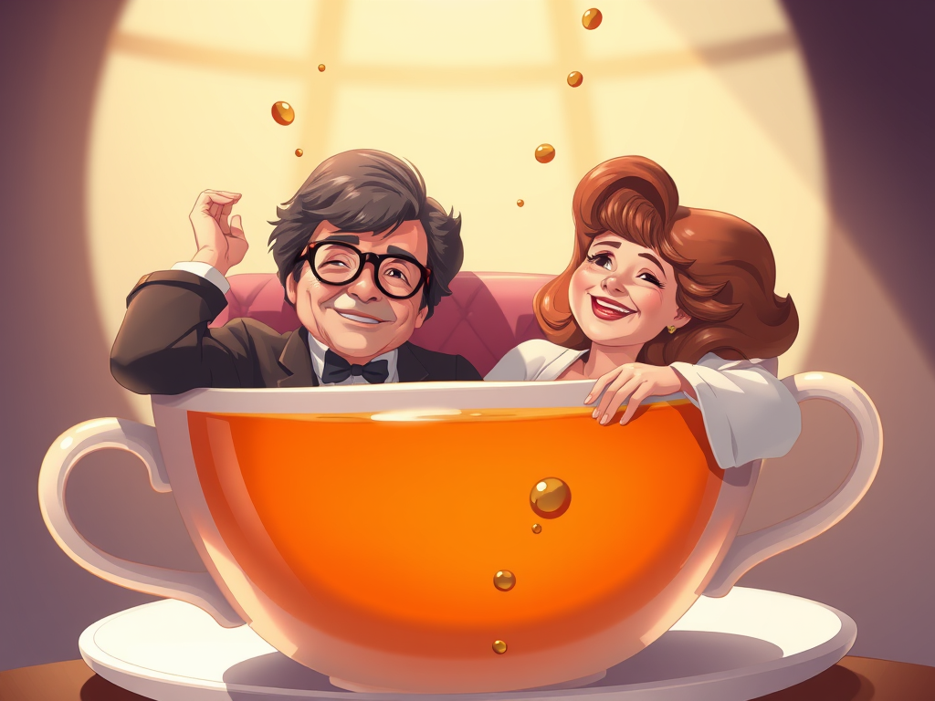 Patrick McGoohan and Elisabeth Sladen relaxing in a giant cup of tea.