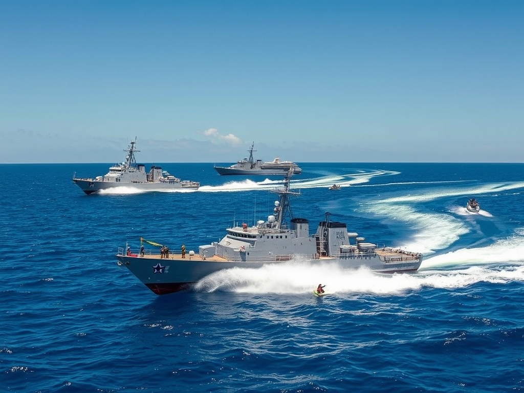 INPUT: The Bolivian Navy doing maneuvers in the South Pacific pulling water skiers behind their ships.