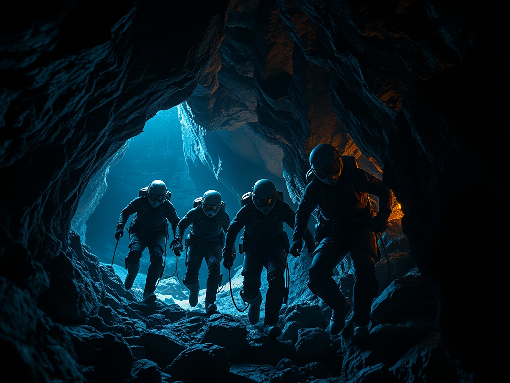INPUT: A group of spelunkers wearing advanced bio-suits descending a tortuous passage in a cave that leads to the center of the Earth.