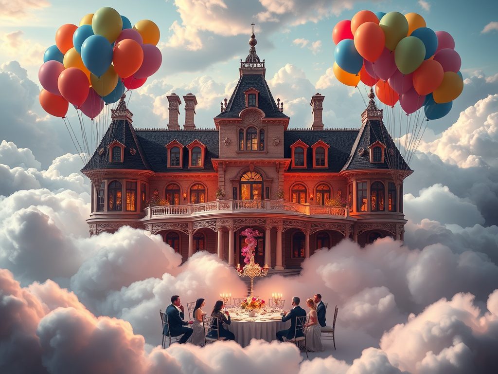 INPUT: A mansion floating in the clouds suspended by colorful balloons and an elaborate dinner party is taking place with gentlemen and ladies in tuxedoes and ball gowns.