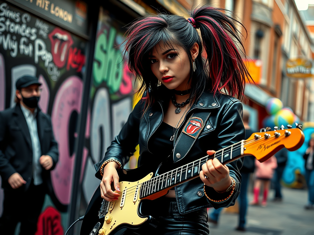 INPUT: A punk princess in SoHo London playing a Fender Stratocaster while the Rolling Stones, The Who, and Iggy Pop are begging for change in the background.