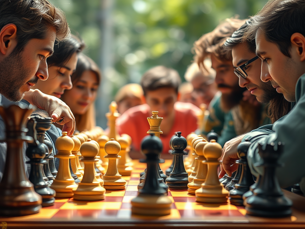 INPUT: Chess pieces playing a game with real live humans on a chessboard.