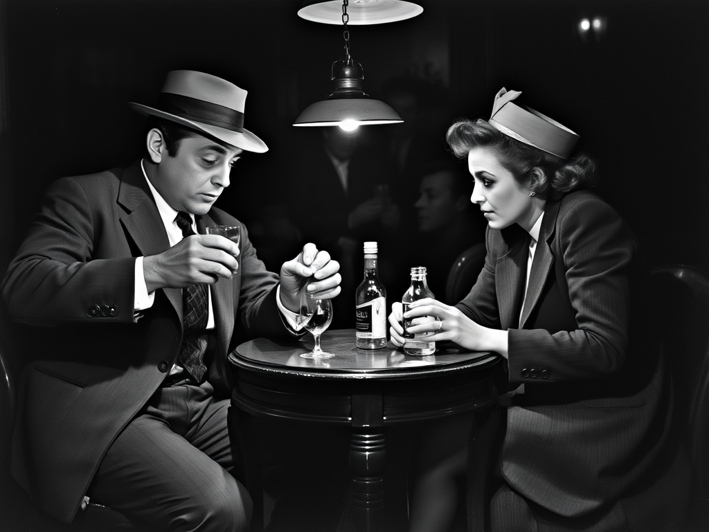 Humphry Bogart and Ingrid Bergman sipping a drink in a speakeasy as G-Men burst in on them in black and white.