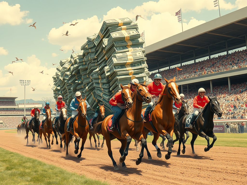 INPUT: Giant wads of cash watching a race in which horses are riding humans around an oval track.