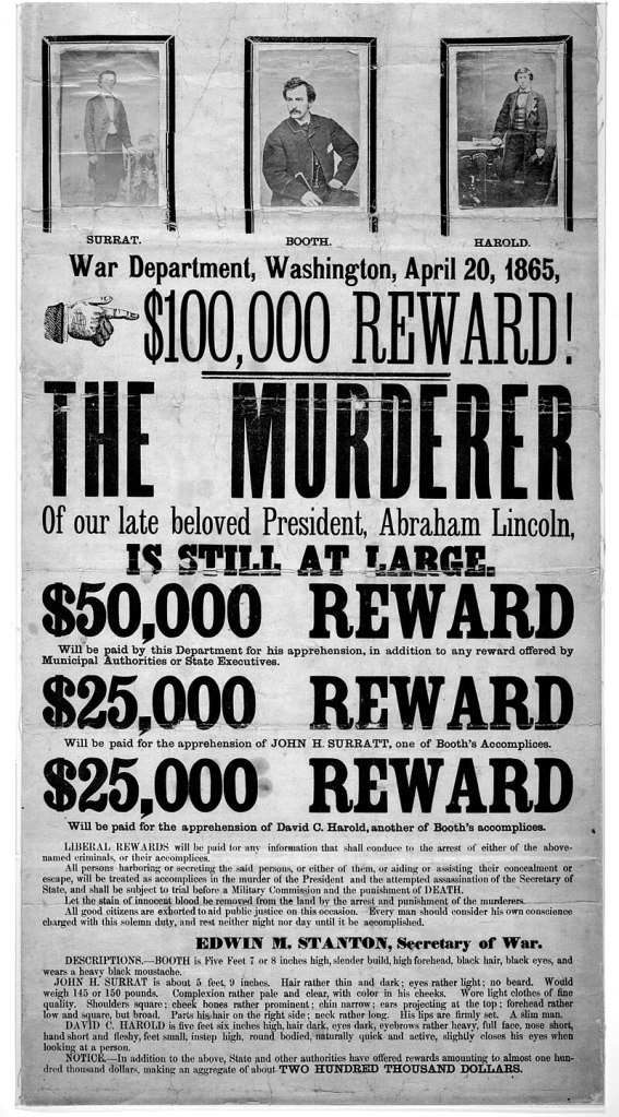But even this benevolent leniency wasn’t enough for some people, particularly for a well known stage actor, John Wilkes Booth, who was a Confederate sympathizer and member of a conspiracy group that wanted to first abduct the president, then to assassinate him. Booth had even attended Lincoln’s second inauguration and lamented that he hadn’t enacted his nefarious scheme at that event.